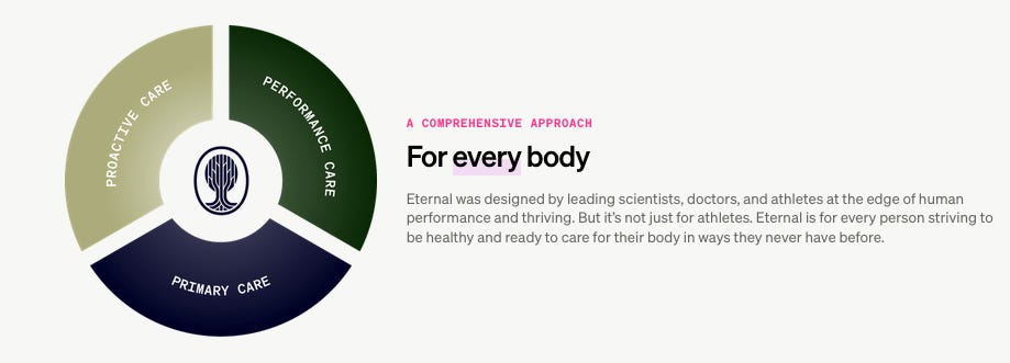 This group sits at the intersection of performance, wellness, and primary care; and no existing system has been designed around them. What we’re seeing in newer care models, including but not limited to Eternal, isn’t a niche preference.